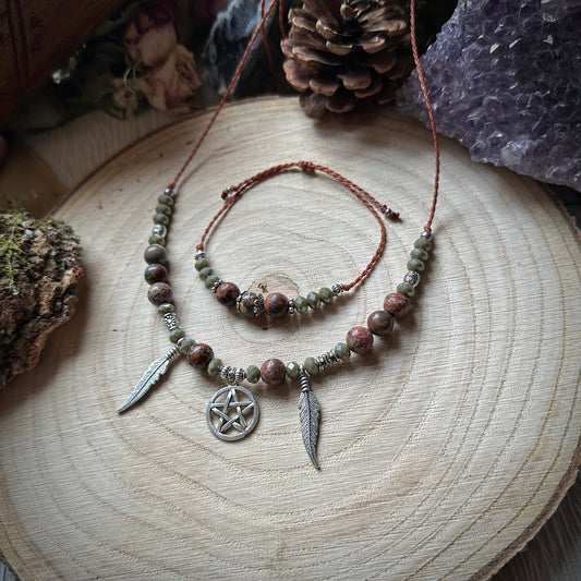 Hexen Makramee Schmuck Set – Pentagramm, Feder & Picasso Jaspis