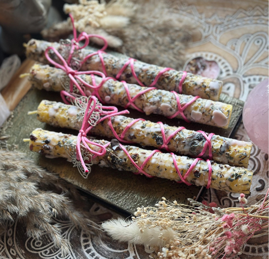 Ritualkerze Frühlingszauber– Handgefertigte Bienenwachs-Stabkerze mit Rapswachs, Kräutern & magischem Mottenanhänger