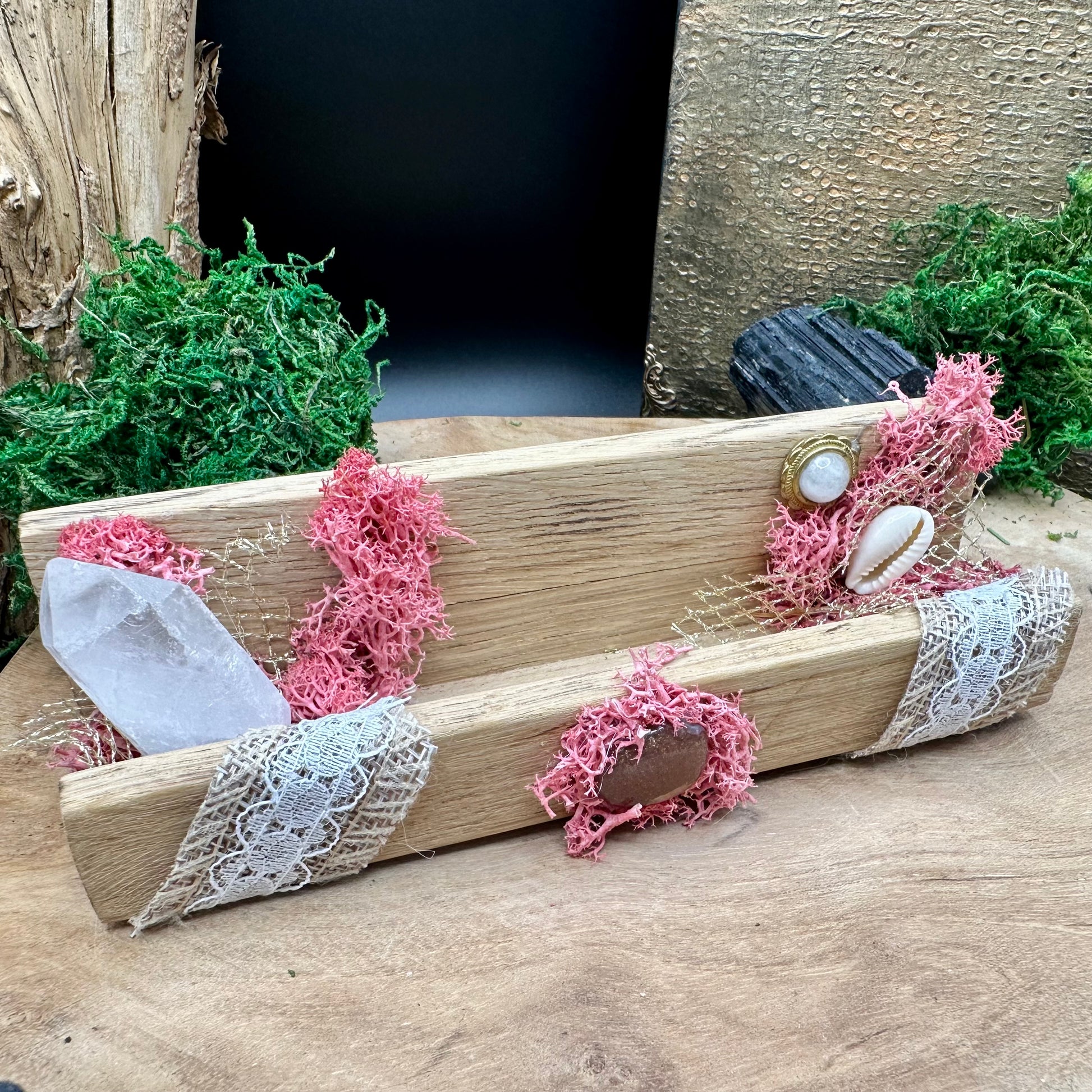 ✨ Materialien: Holz, Bergkristall, Mondstein, Muscheln, Spitze, Naturmoos