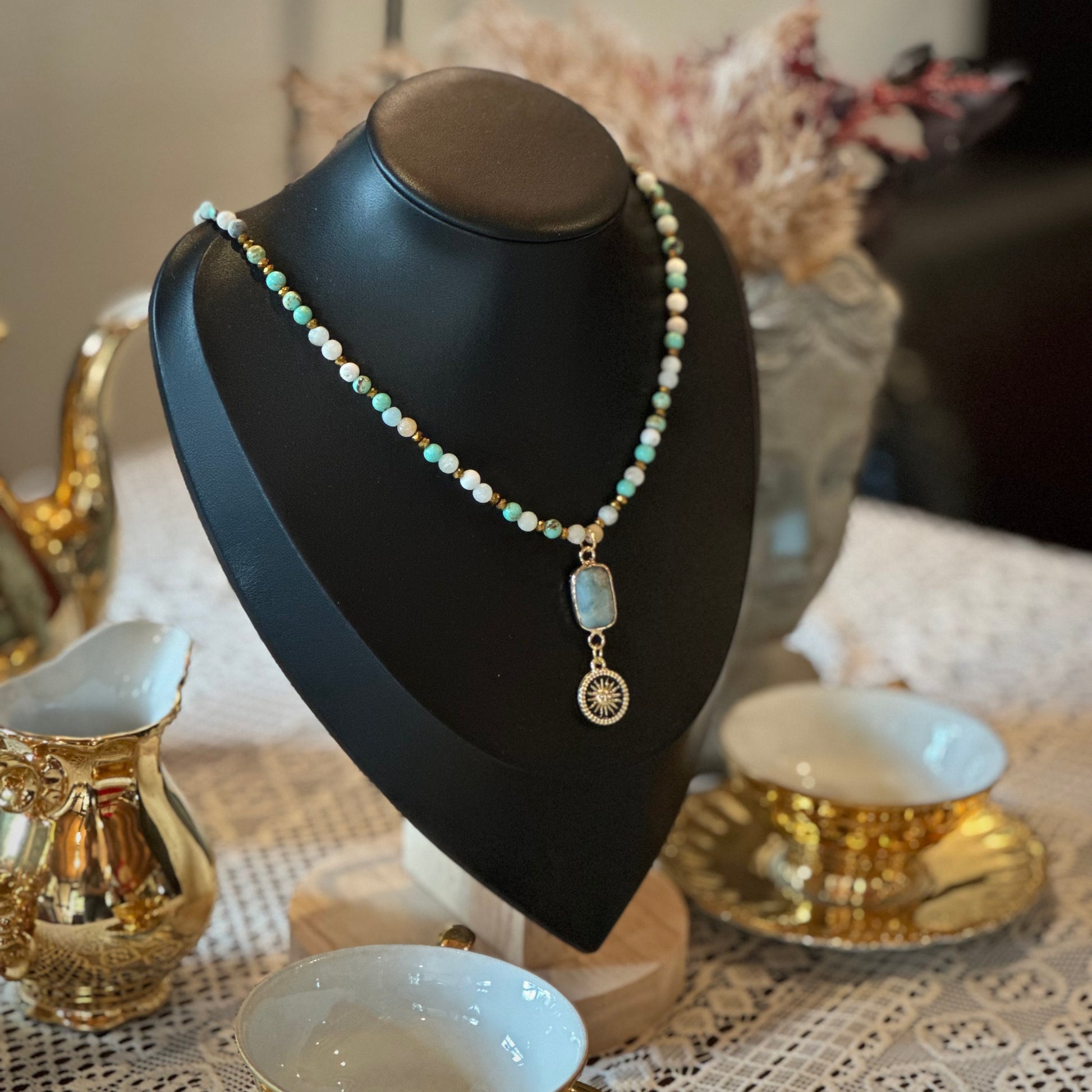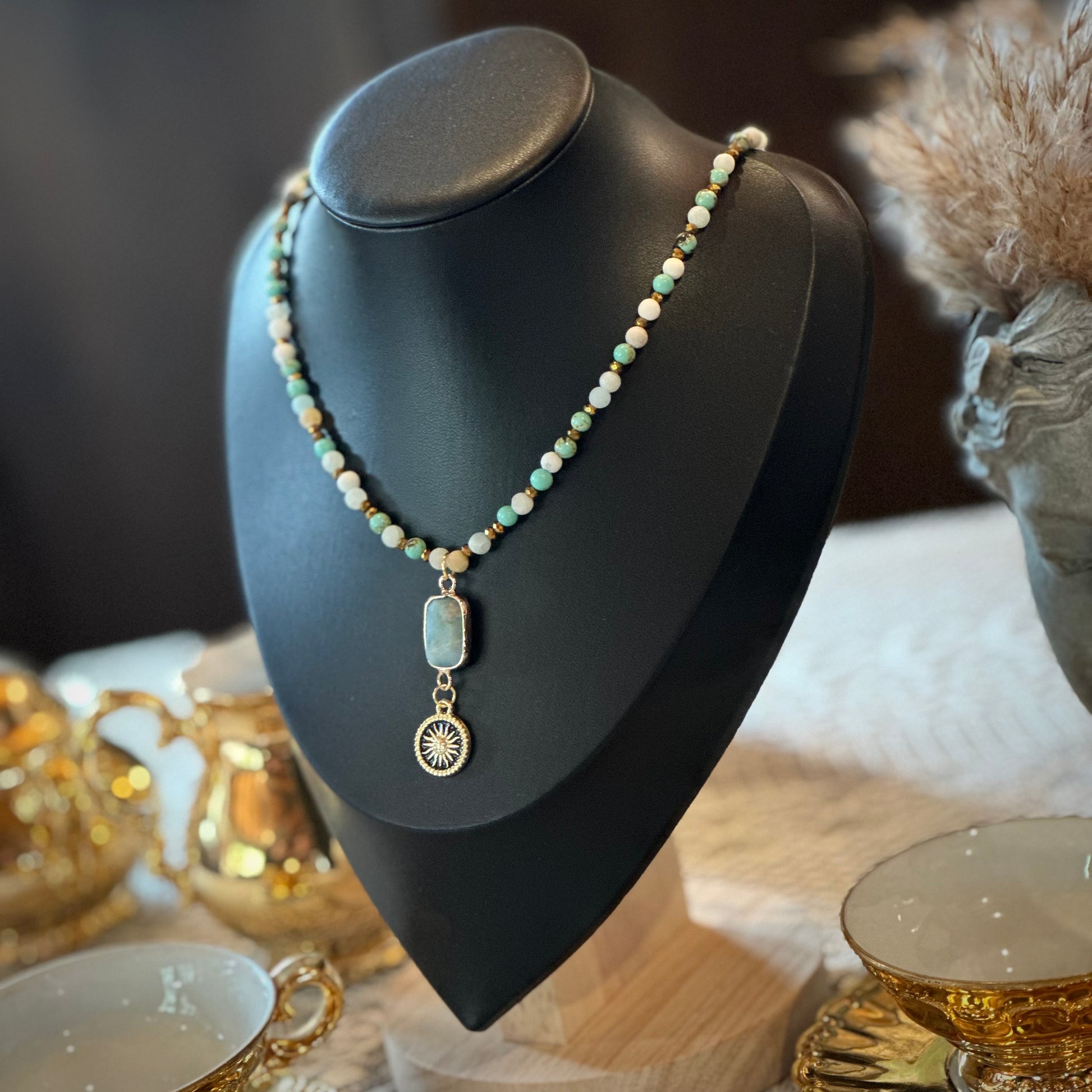 Im Mittelpunkt steht ein rechteckiger Amazonit-Anhänger, eingefasst in goldfarbenem Edelstahl. Darunter rundet ein stilvoller goldener Medaillon-Anhänger mit Sonnenmotiv das Design ab – Symbol für Kraft, Lebensfreude und innere Strahlkraft.
