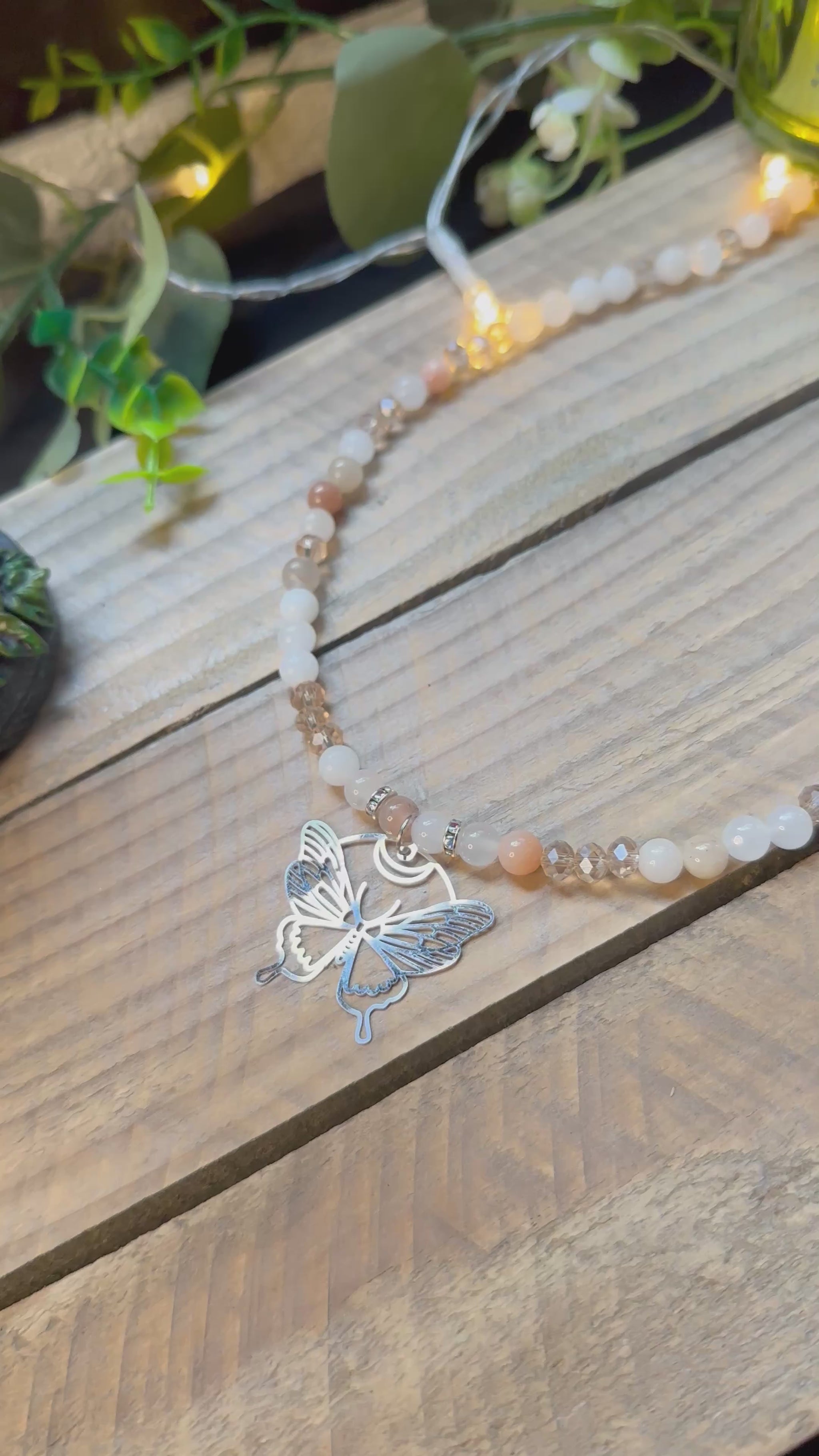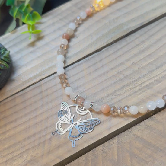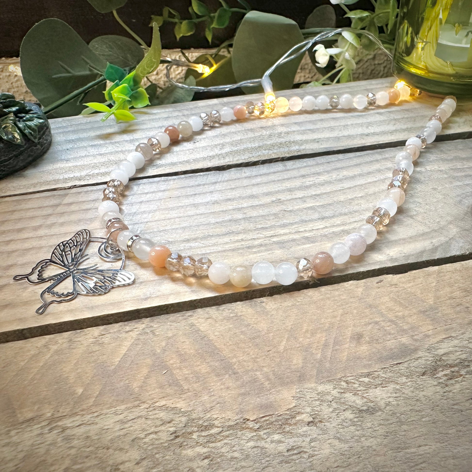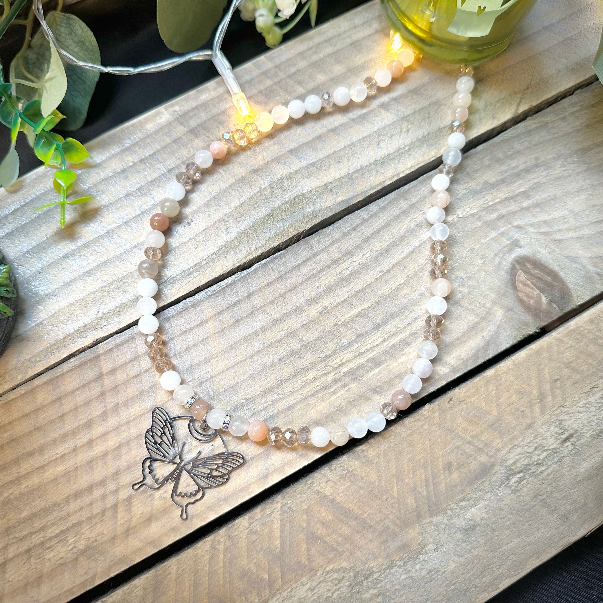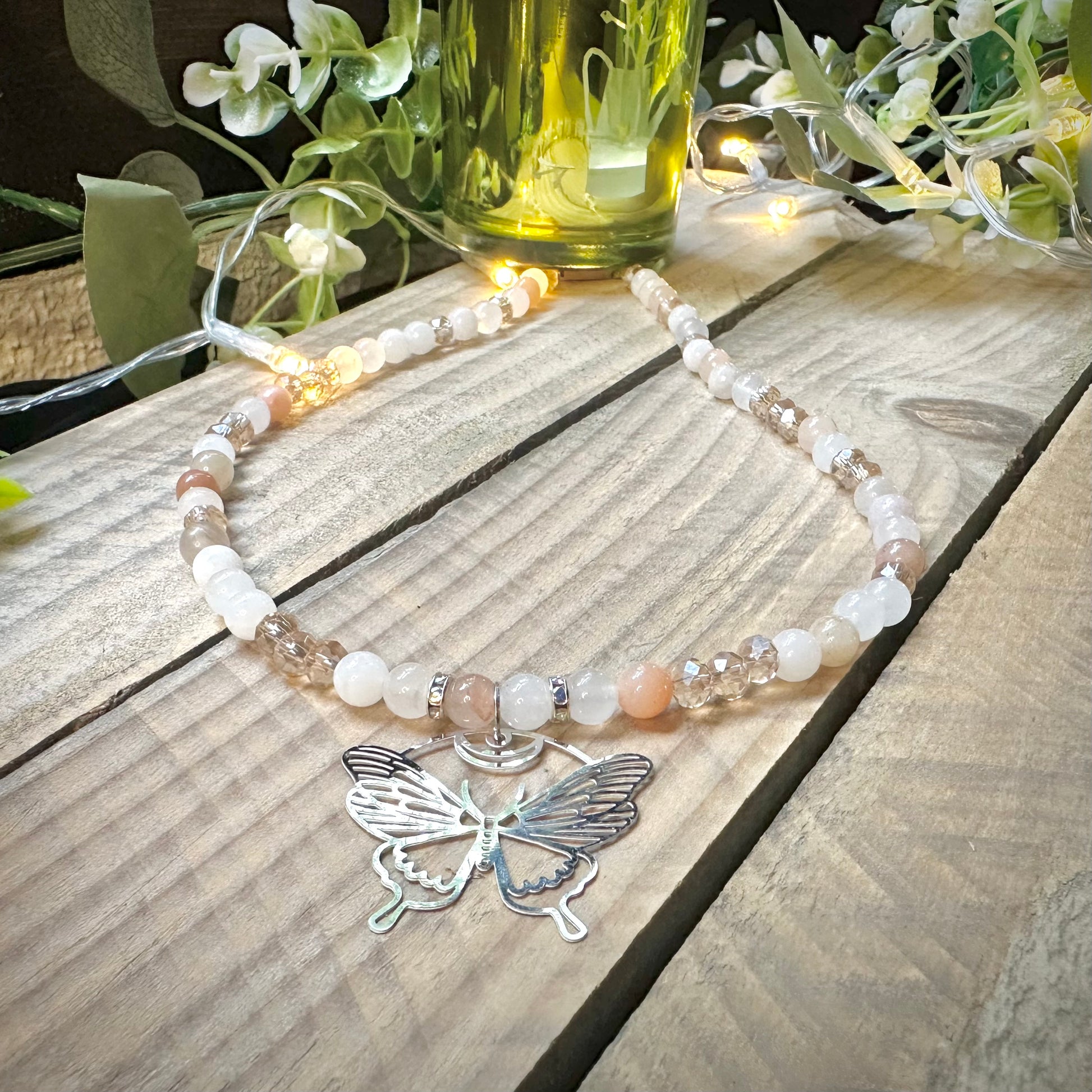 Diese handgefertigte Kette vereint die zarte Magie des Mondsteins mit der Leichtigkeit des Schmetterlings. Die sanft schimmernden Mondstein-Perlen wechseln sich harmonisch mit funkelnden Kristall-Elementen ab und fangen das Licht auf wundervolle Weise ein.