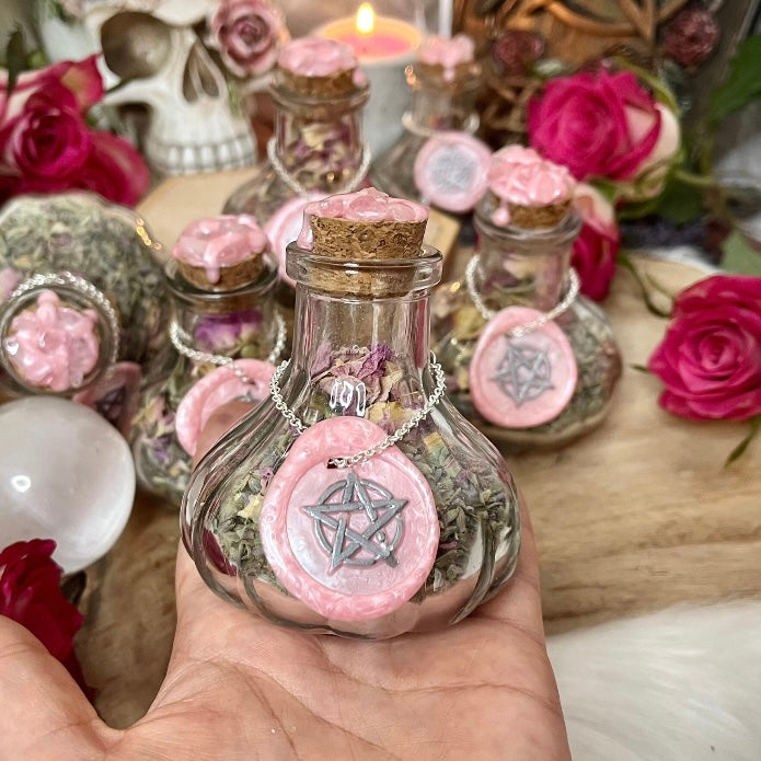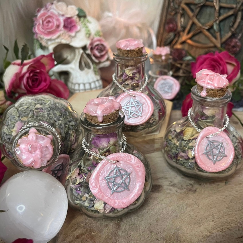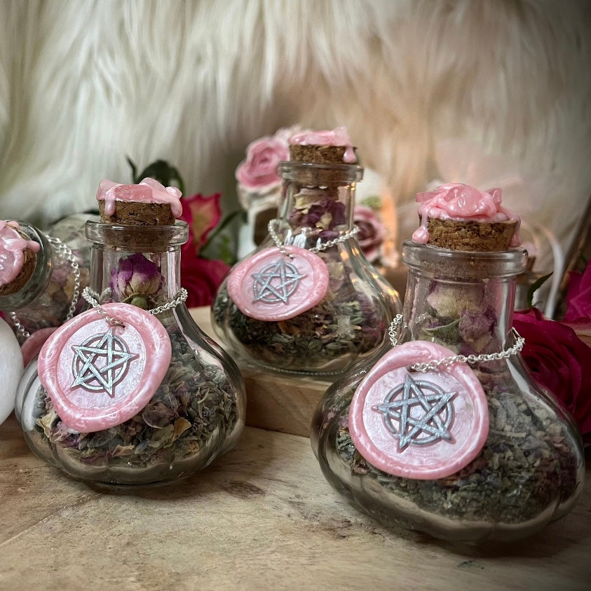 Jede Glasphiole ist gefüllt mit einer harmonischen Mischung aus feinen Kräutern, zarten Blüten und erlesenen Harzen – abgerundet durch ein versiegeltes Pentagramm-Amulett als Schutz- und Kraftsymbol.