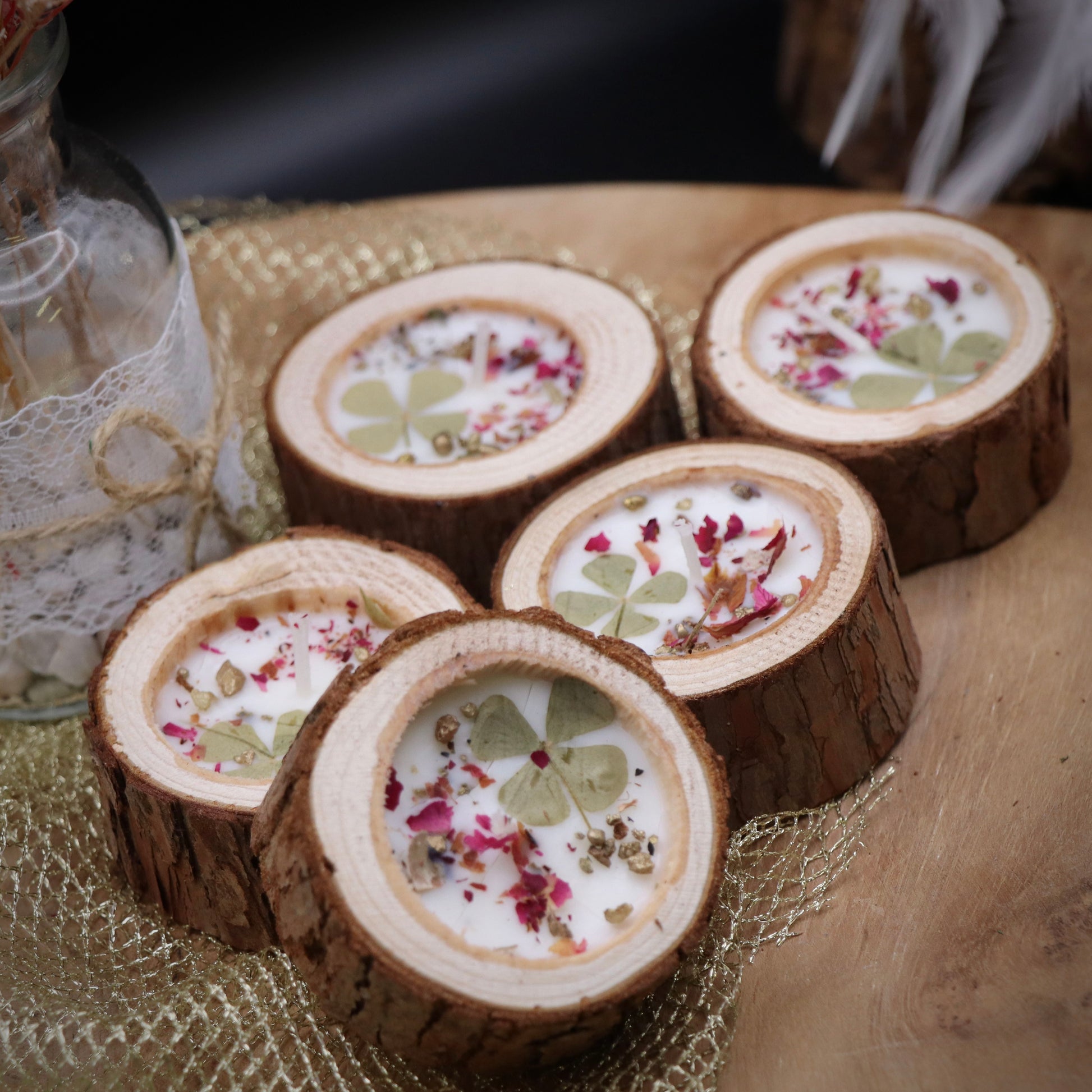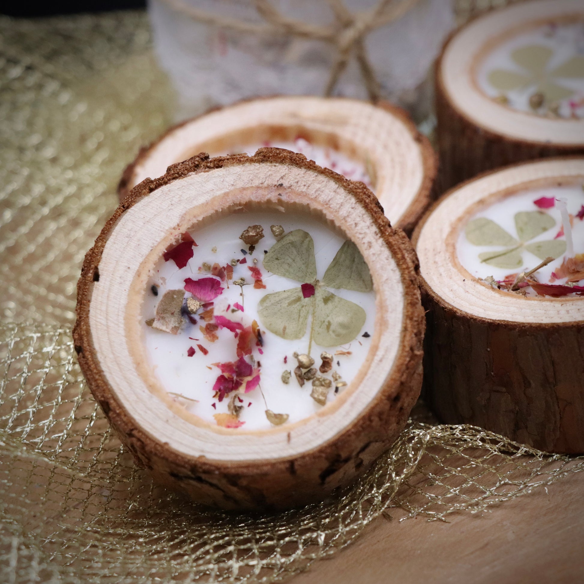 Material: Sojawachs, Holzschale, getrocknete Blüten, Kleeblatt, goldener Weihrauch, Baumharz