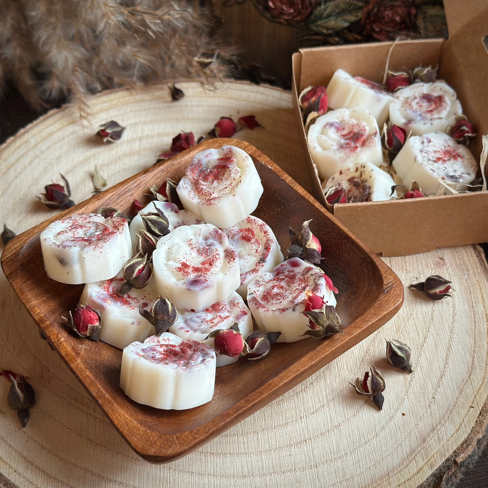 - Echte Rosenblüten: Jeder Melt ist mit zarten, handverlesenen Rosenblüten veredelt, die nicht nur einen Hauch von Eleganz verleihen, sondern auch die Energie und das Aroma der Liebe symbolisieren.