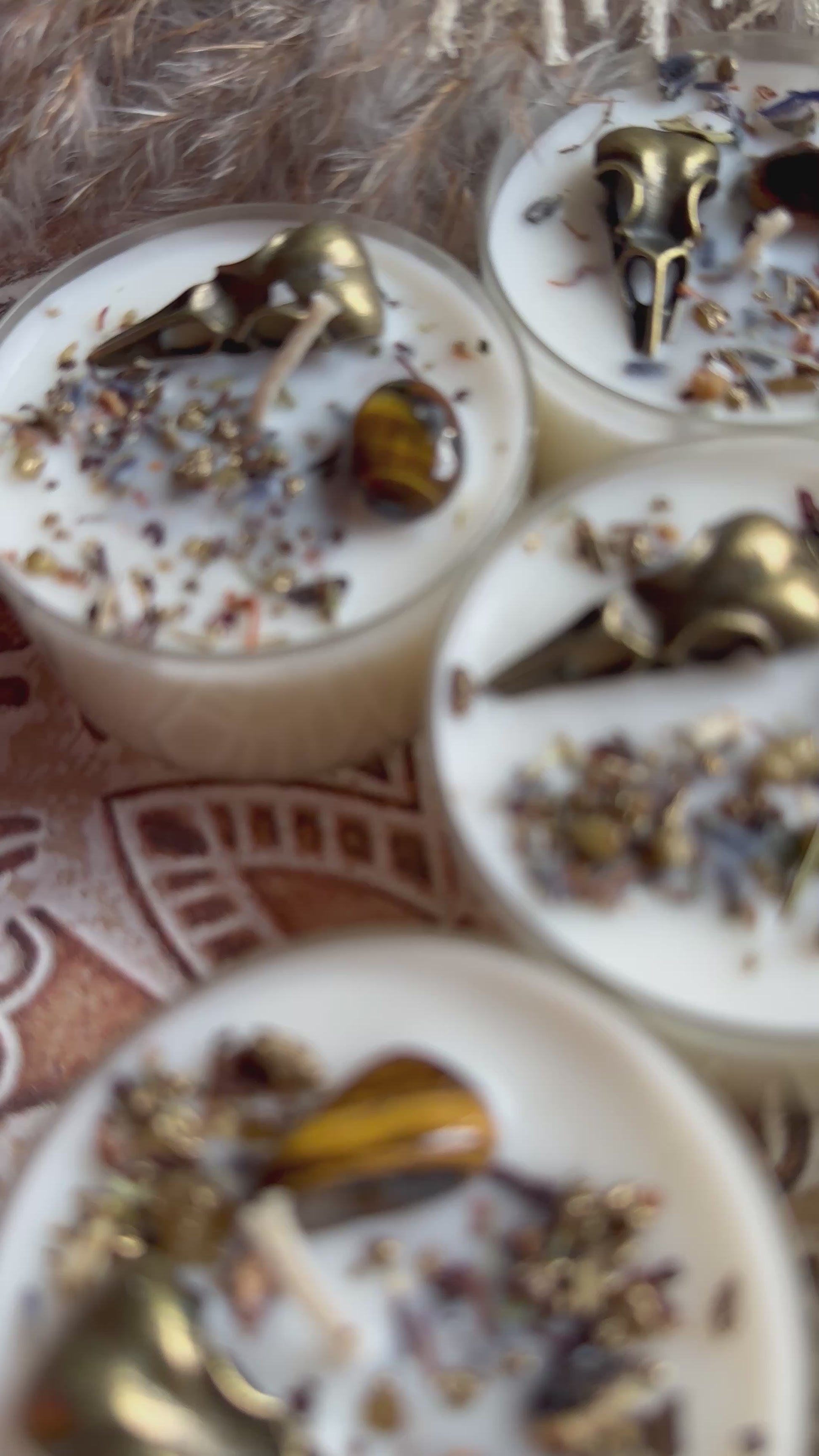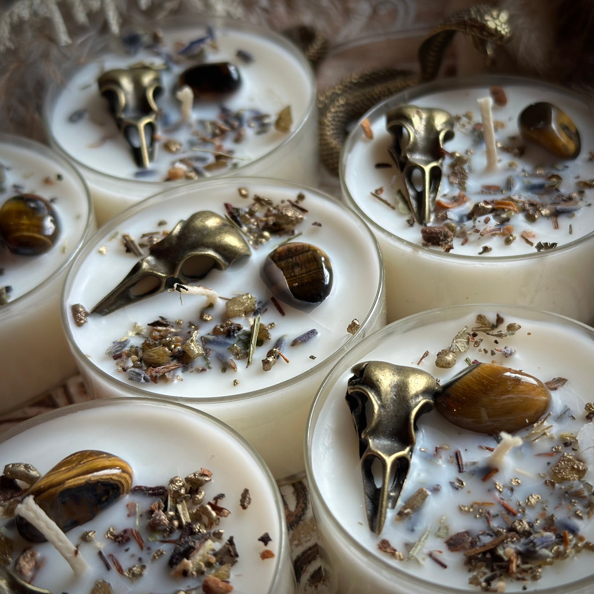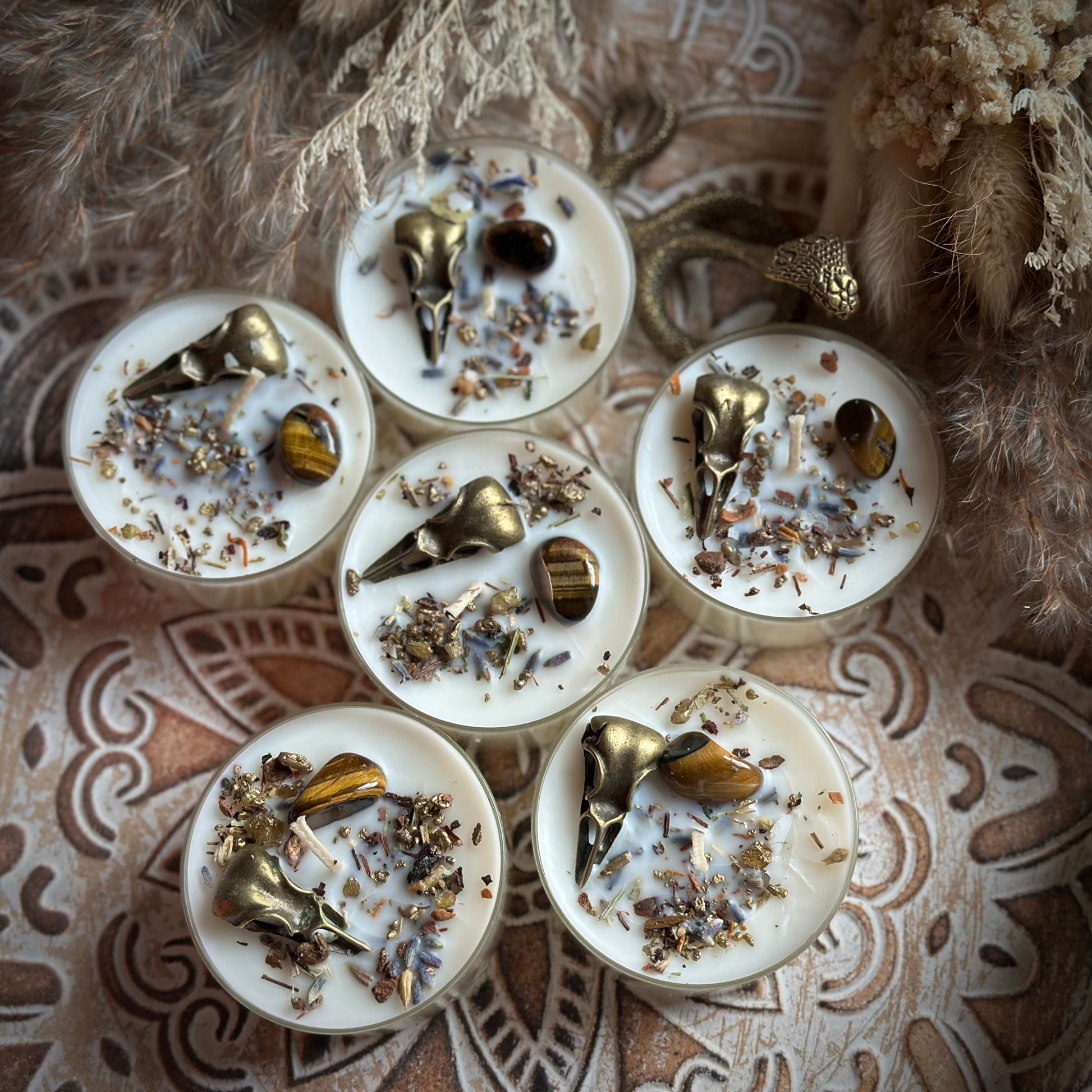 Kristall Maxi Teelicht „Krafttier Rabe“ mit Tigerauge und kraftvoller Kräutermischung für die Verbindung zur Anderswelt